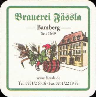 Fässla, Obere Köningstraβe 19-21, Bamberg. ( 0830-2300 ). Opposite Spezial and offering a totally different style of brewing, Fässla produces "normal" beers which are okay if a little bland after the delights over the road. The casks on the bar are fakes, but the beers (lagerbier and gold pils) aren’t gassy and are perfectly drinkable. The bottled brews give greater prominence to flavour and Zwergla and Bambergator are fine drinks in their own right. There is also a 20 room hotel, bookable online, which at around €52 a night for a double with breakfast is eminently reasonable, even more so with the early morning brewing steam drifting through the windows. A great base for exploring the town.