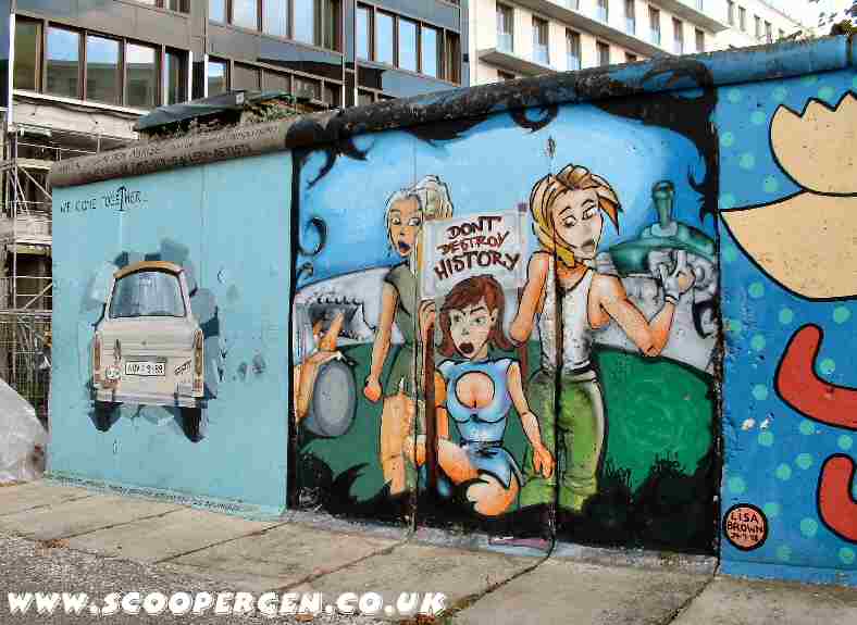 Enjoying the sunny weather, we crossed the U2 tracks and returned to our original route – and there, on the corner of Stresemanstraße and Ernabergerstraße, was a small section of wall and a watchtower - and these bits weren’t tourist magnets like those on Potsdamer Platz, but a small section which had somehow survived the mass rebuilding of the area. The site they were on was due to be redeveloped but, thanks to local protests and the painting of the wall by some of the original “East-side gallery” artists, it was to be incorporated into the new building’s foyer. The wall carried the reverse of the famous “Trabbie through the wall” painting on the ESG by Birgit Kinder but this was seen from the back of the car – and it was in immaculate condition too! “Don’t destroy history” screamed the message on the wall and, for once, big business seems to have listened! Respect to the artists who have saved this piece of history from destruction.