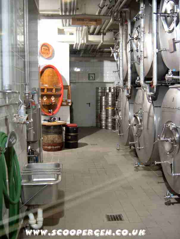 We looked up at the brewplant which, in contrast to most German examples, was stainless steel and reminiscent of that seen in the unlamented Firkins back home. There seemed to be some activity still going on inside with the brewer moving between the vessels and steam billowing out of the roof vent. Down in the bräukeller we were impressed with the surroundings; it was a dark, peaceful and relaxing place with brewery stuff on the walls and random brewing bits scattered around. Our bad luck with seasonal brews continued, however, as only the standard pils, dunkel and weizen were available with the next special not due on until the 2nd of December!