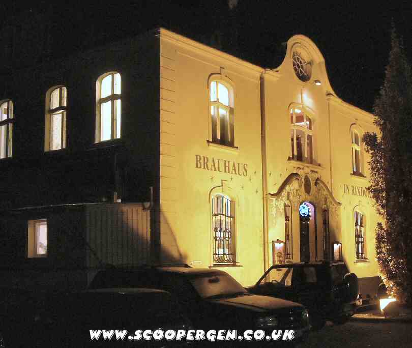 Despite these interesting beers being very inviting for another round we were now on a mission, so paid up and scuttled back down the steps to Alexanderplatz station just over the road. We took the U8 to it’s southern terminus at Hermanstraße and then set off in search of the Brauhaus Rixdorf which didn’t sound that easy to find – happily it was, although we did have second thoughts whilst walking down Delbrückstraße until we saw the pub (helpfully illuminated) through a sort of carpark next to a chimney; once you know this it’s quite easy to find!