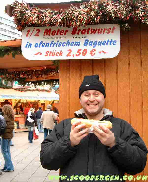 Sue, not caring for sausages with the same devoutness as myself, soon found a snack of her own - a dampfnudel - which was a steamed dumpling covered in custard and cherry sauce which went down a treat too, although it did resemble a thyroid gland sitting in pus and blood – or so I thought anyhow. One delicacy not tried was a “Smurf apple” which was basically a toffee apple coated with unidentified luminous blue gunge, or how about a “Dracula apple”, which had a slice cut from it and teeth inserted to give a reasonable likeness of it’s blood-sucking namesake?
