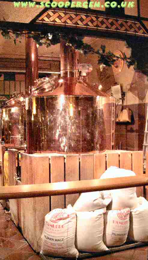 Immediately on entering the pub our noses were filled with the delicious aromas of brewing – and by the smell of it the hot break was just commencing, my favourite part! Finding a seat proved to be no problem and we bagged a table near to the copper to watch the brewer (who seemed to be wearing some rather un-fetching Bavarian lederhosen) in action, so to speak. On reading the menu it became clear that only one beer was brewed on-site and the place was owned by Traunstein, who own some other brewpubs such as Isarbräu at Großheselohe, near München, and the other beers were supplied by them – although they seemed to do a roaring trade in the homebrew mixed with various unlikely-sounding drinks; wheat beer and fizzy orange or cola, anyone? Yeuuch!