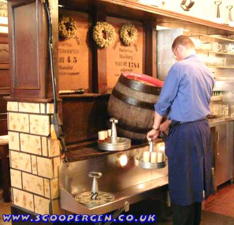 The next visit on the itinerary was Sion. This bräuhaus (which in Köln just means a pub which may have brewed at some point in it’s history as opposed to actually brewing now) was reduced to rubble thanks to the RAF and USAF during the war and was rebuilt without it’s brewery. The beer now comes from the huge KVV plant but Paul Harrop told us that it was the only one from there still to have some character so, therefore, was the only one ethically available for scooping! Respecting his knowledge on these matters we decided to give it a go and see how bad (or good) it was. After only a few minutes walk we were sitting inside the pub with the impressive bar in front of us upon which 2 metal casks sat. Wooden ones, even though they probably don’t add much taste-wise to the beer, look a hell of a lot better! The service was fairly slow despite us sitting opposite the bar and, in the end, the beer pourer took pity on us and drew us some kölsch (in bars, there is usually 1 bloke pouring the beer and x waiters delivering it and taking money, although in some places the waiters also do their own pouring) that was, as Paul had said, gently fruity and hoppy without being too interesting.